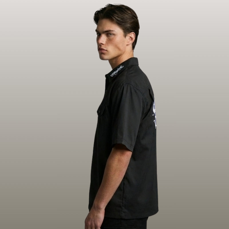 The Maverick is a short-sleeve button-up tee that blends casual comfort with embroidered detail. Crafted from 100% cotton, it brings a natural, breathable feel built for warm-weather wear. The lapel collar and loose fit give it a relaxed, open-neck profile that works untucked and laid-back.