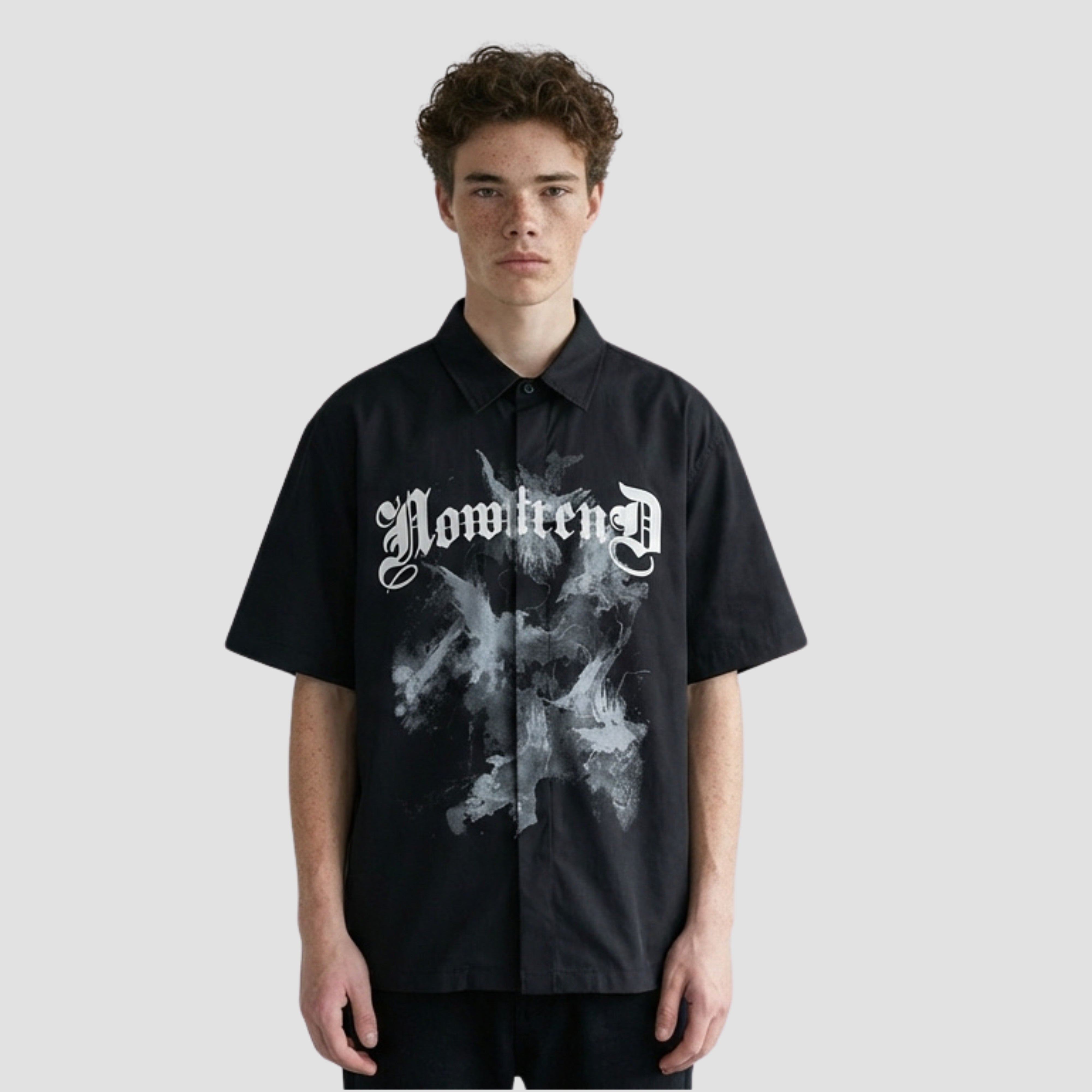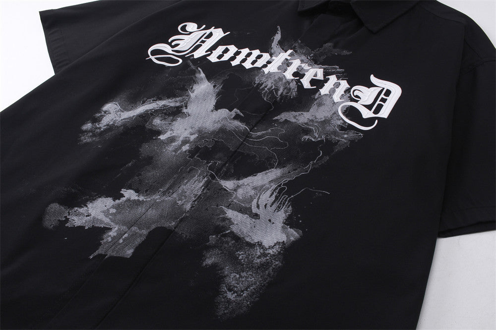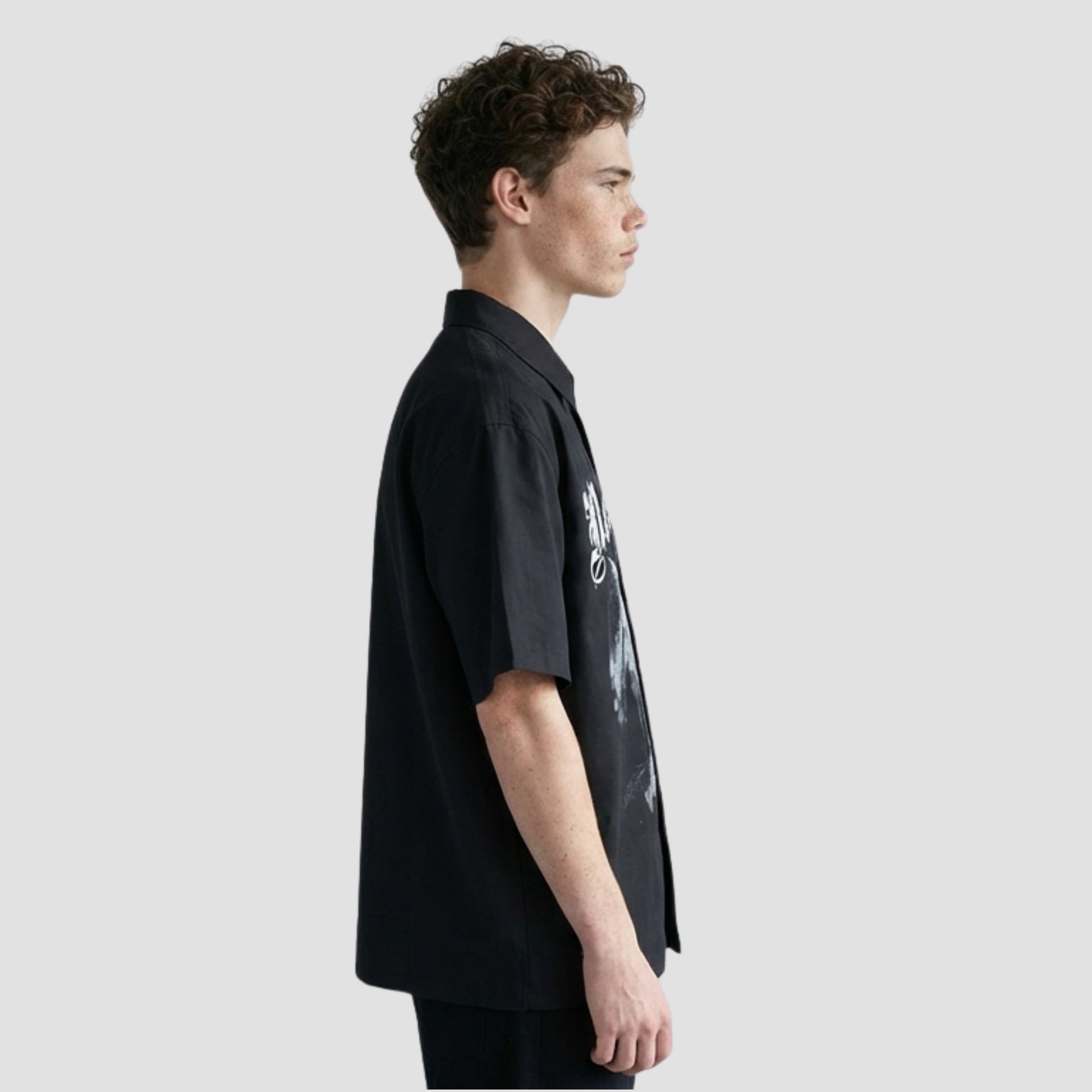 The painted print technique gives each piece a raw, artistic quality that stands out from standard graphic tees. Short sleeves and a button-front closure keep the structure clean and easy to wear, open over a tank, or buttoned up for a bolder solo look. Available in White and Black, the Nero pairs with minimal bottoms to let the print take centre stage.