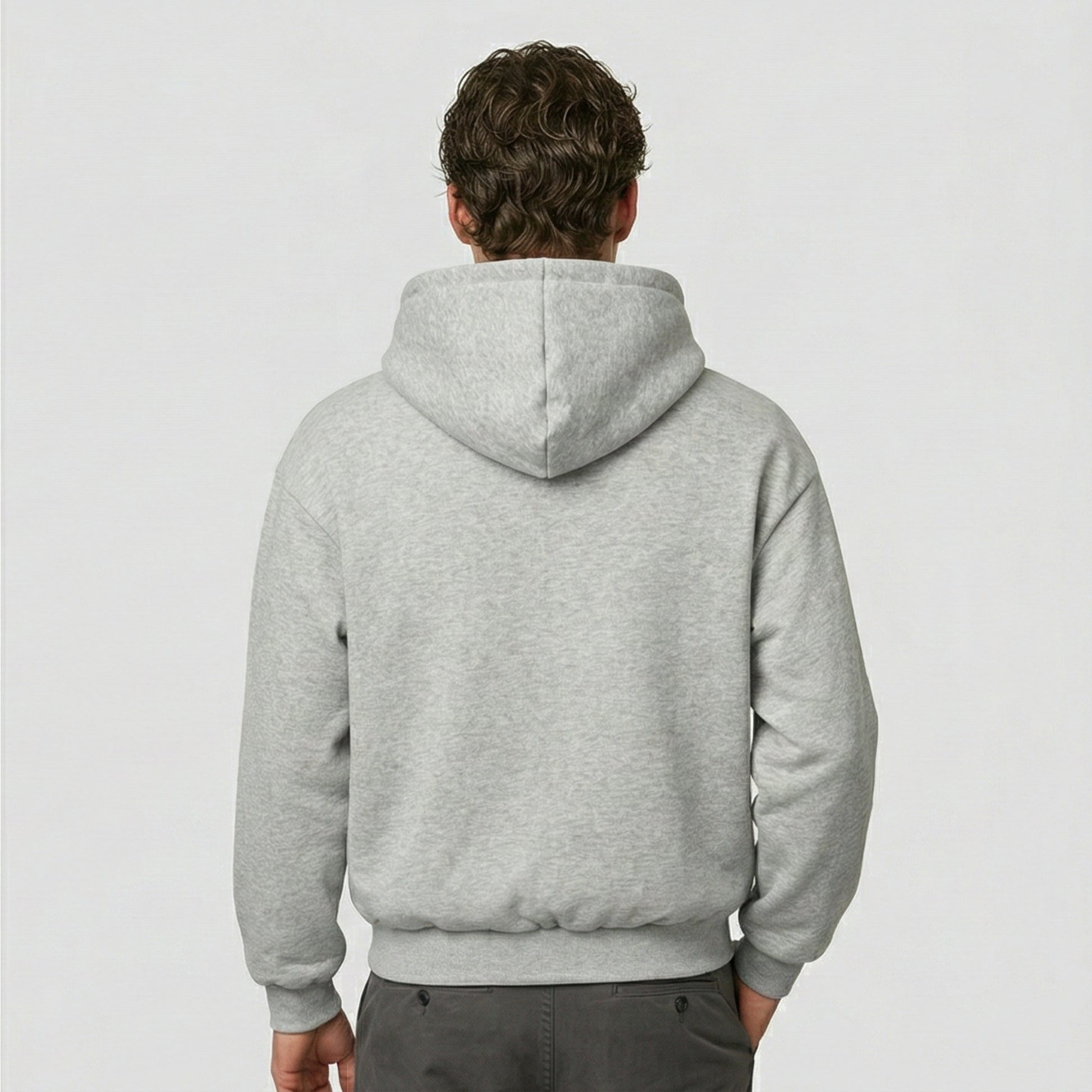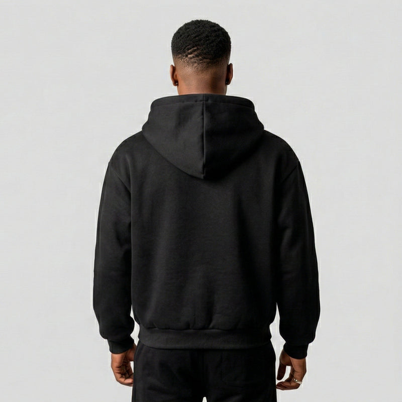 The loose fit and hooded design create a relaxed yet structured profile with significant presence.