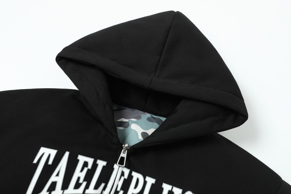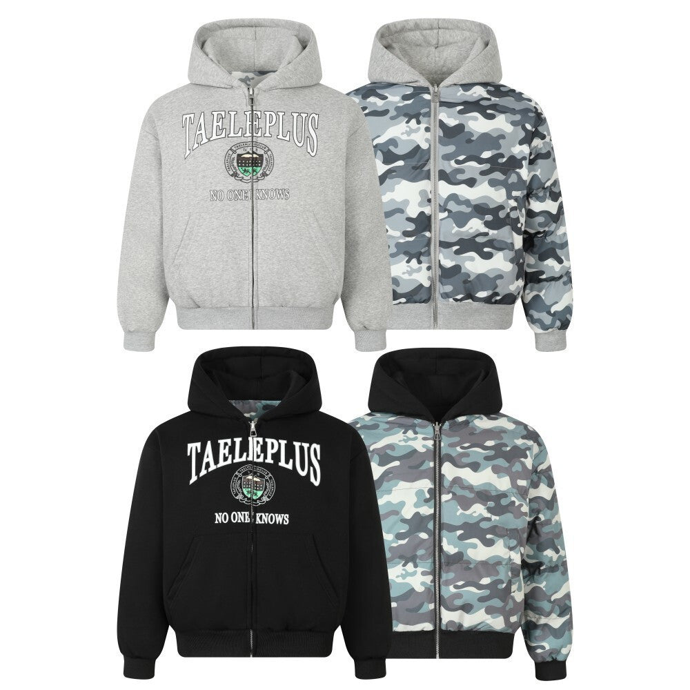 Two hoodies in one concept meets contemporary digital printing in this innovative padded zip.
