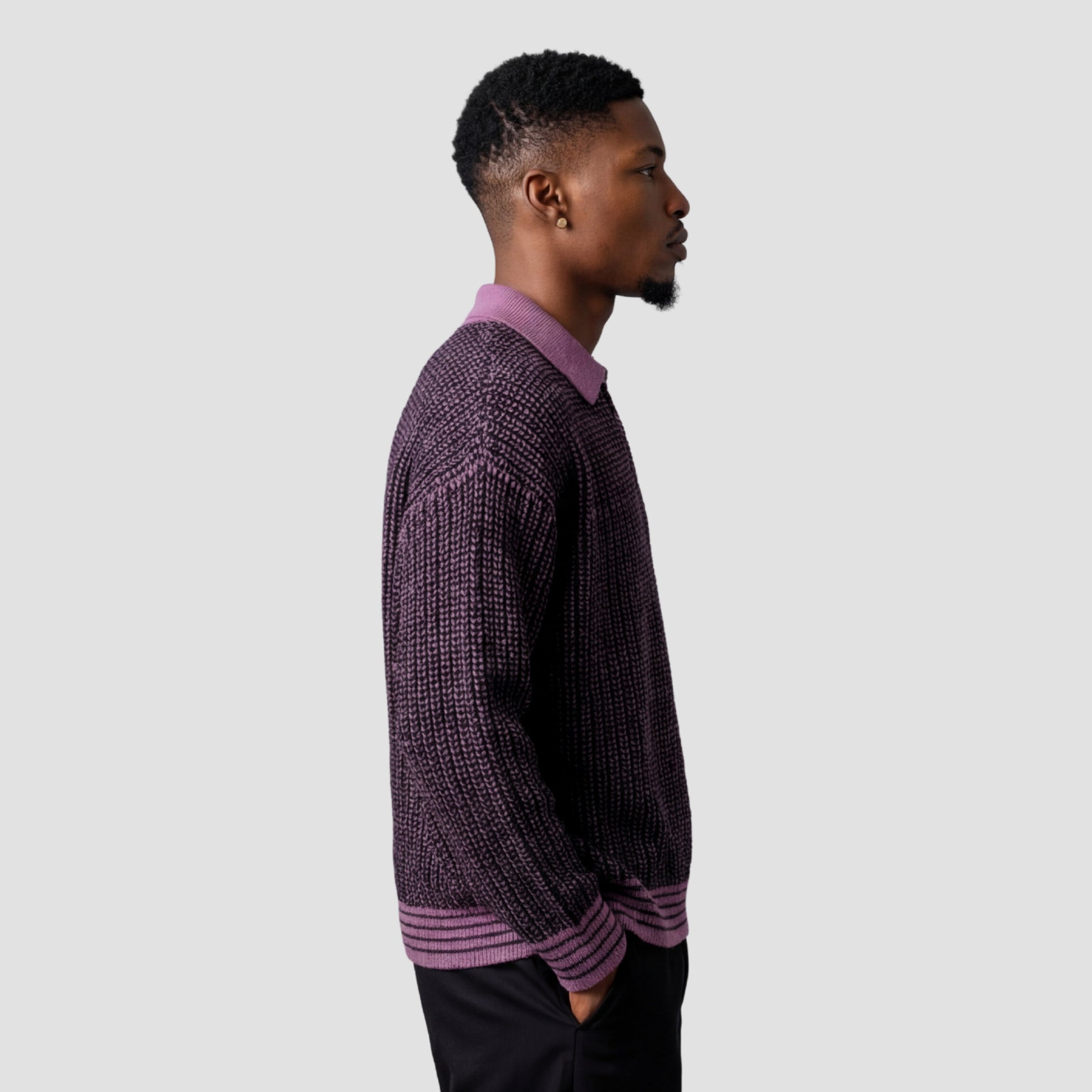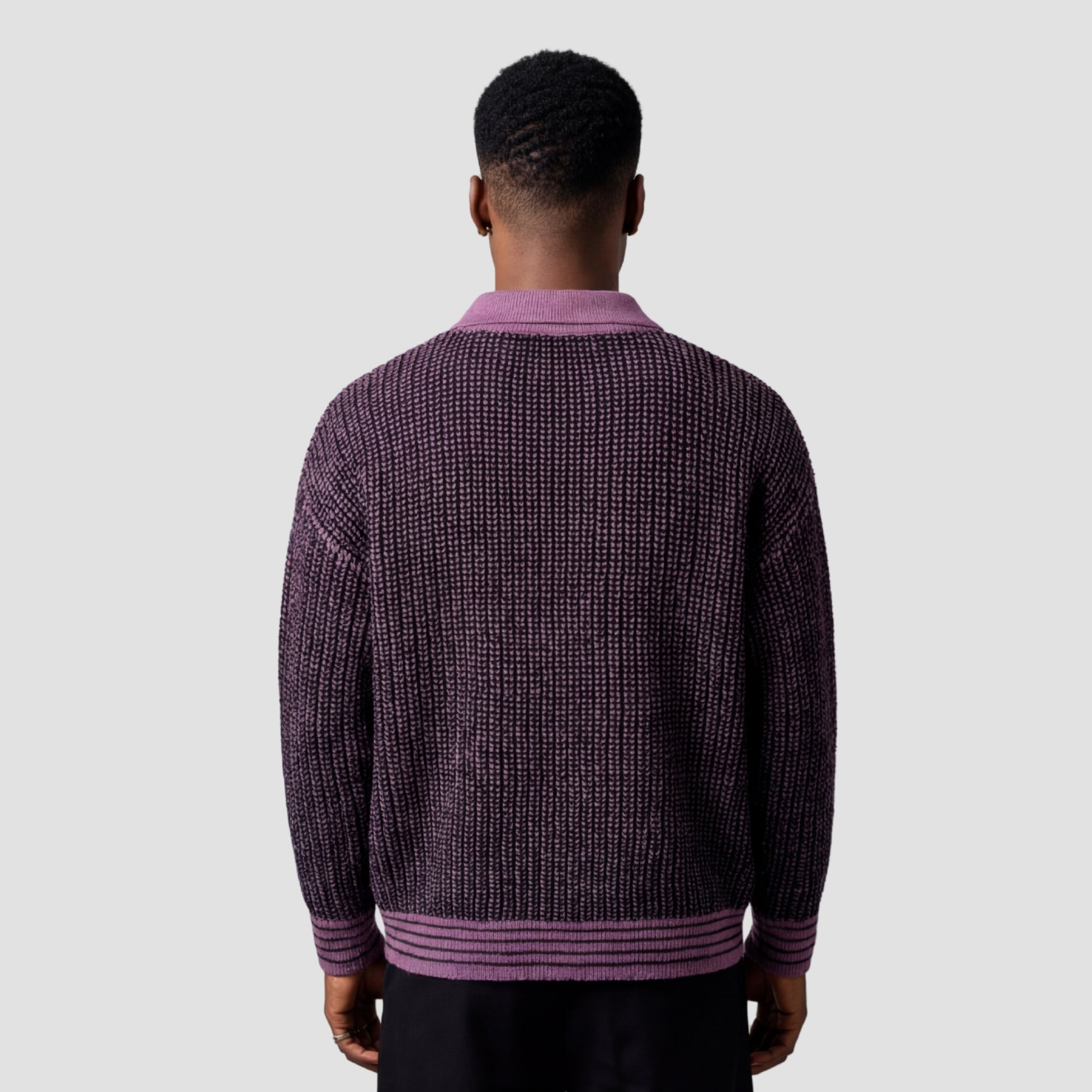 Available in Black and Purple, pair with relaxed trousers and clean trainers for a polished, textured street look.