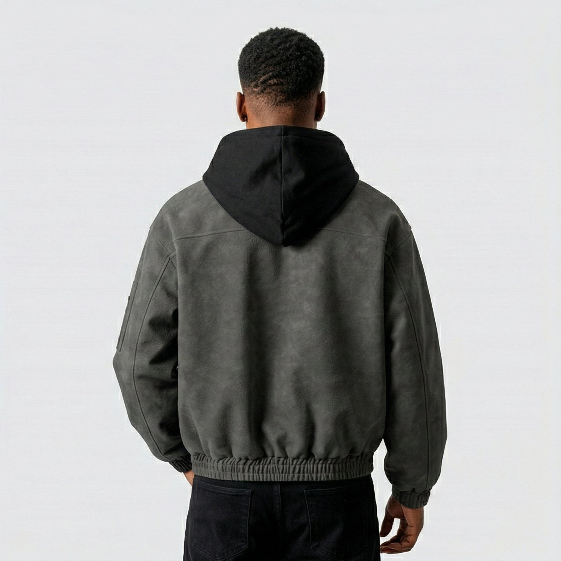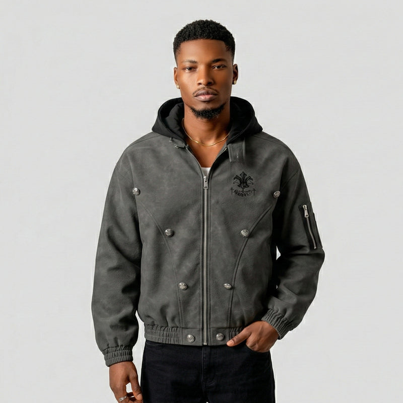 The loose fit and hooded design create an imposing silhouette that commands presence while maintaining everyday wearability.
