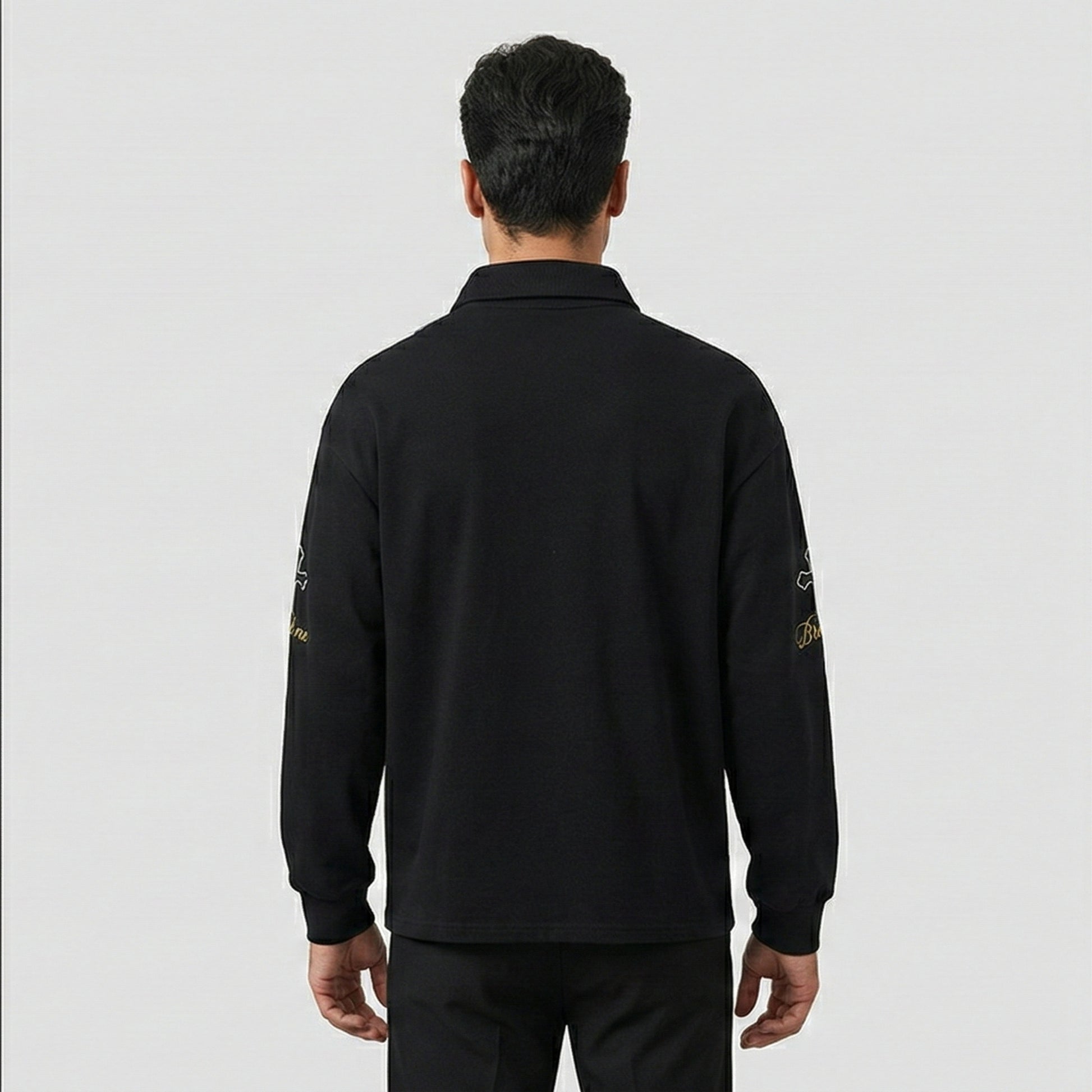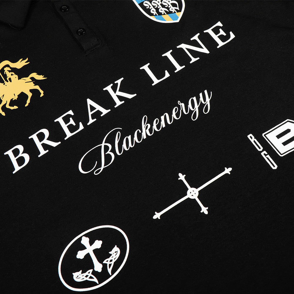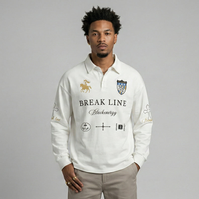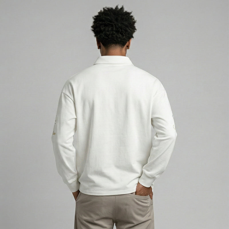 The loose fit and polo collar create a relaxed profile with contemporary edge.